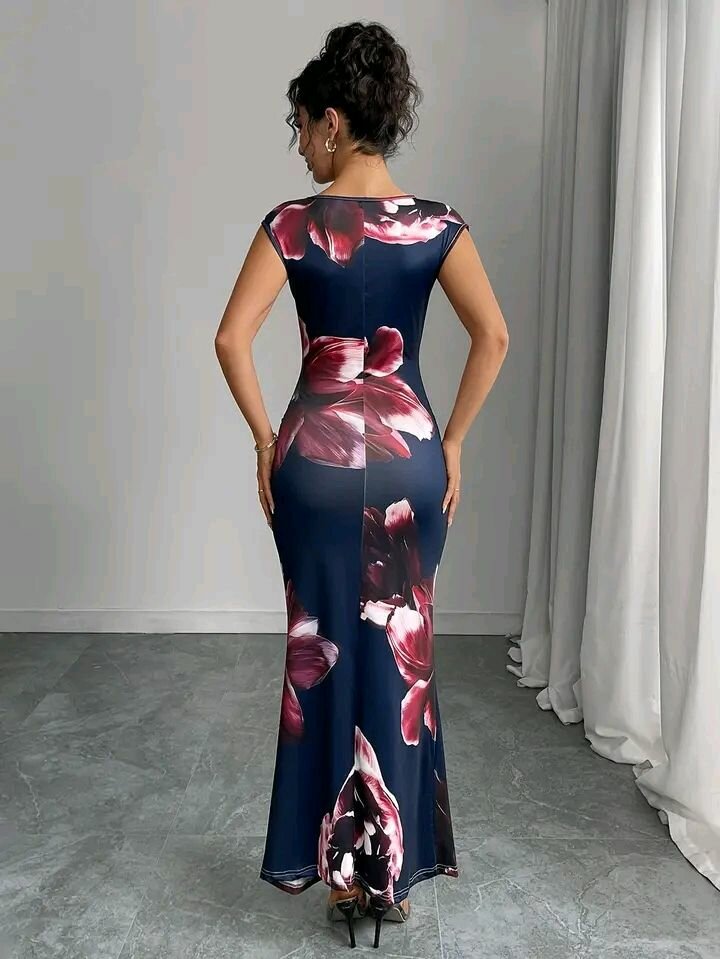 Robe longue bleu marine à fleurs rouges et détails élégants. Parfaite pour les occasions spéciales ou une soirée chic.