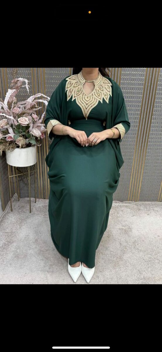 Découvrez cette magnifique robe longue avec un col richement brodé. Parfaite pour les occasions spéciales, elle offre élégance et sophistication avec ses détails dorés et son tissu de qualité. Un choix idéal pour se démarquer avec style.
