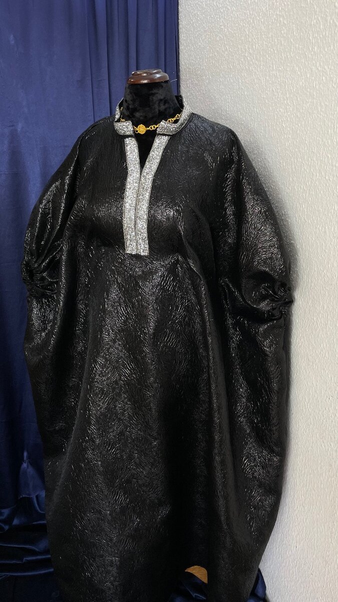Élégante robe longue de style caftan en tissu brillant noir avec des détails scintillants sur le col et le devant. Parfaite pour les occasions spéciales. Confortable et raffinée. Un choix idéal pour un look sophistiqué et glamour.