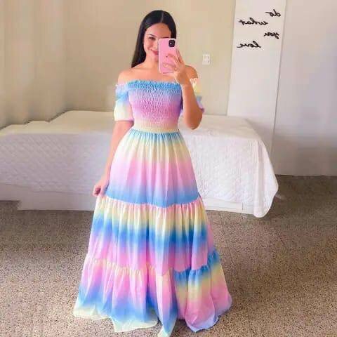 Optez pour cette robe longue et élégante avec un superbe dégradé de couleurs pastel. Idéale pour l'été, elle vous assure une allure féminine et gracieuse lors de toutes vos occasions.