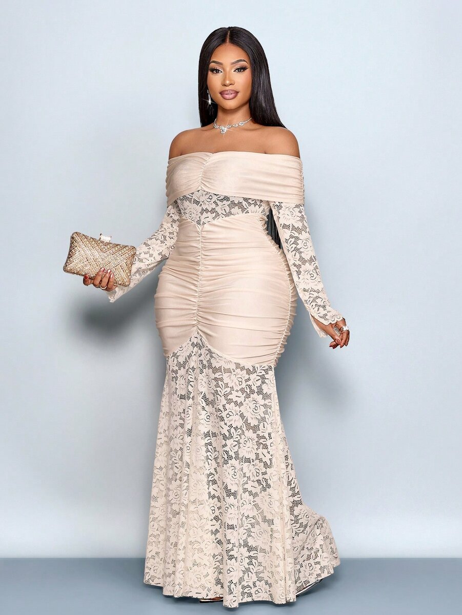Cette robe longue en dentelle, off-shoulder, est idéale pour les soirées et occasions spéciales. Avec sa coupe flatteuse et ses détails raffinés, elle garantit une allure chic et sophistiquée. Parfaite pour un look glamour.