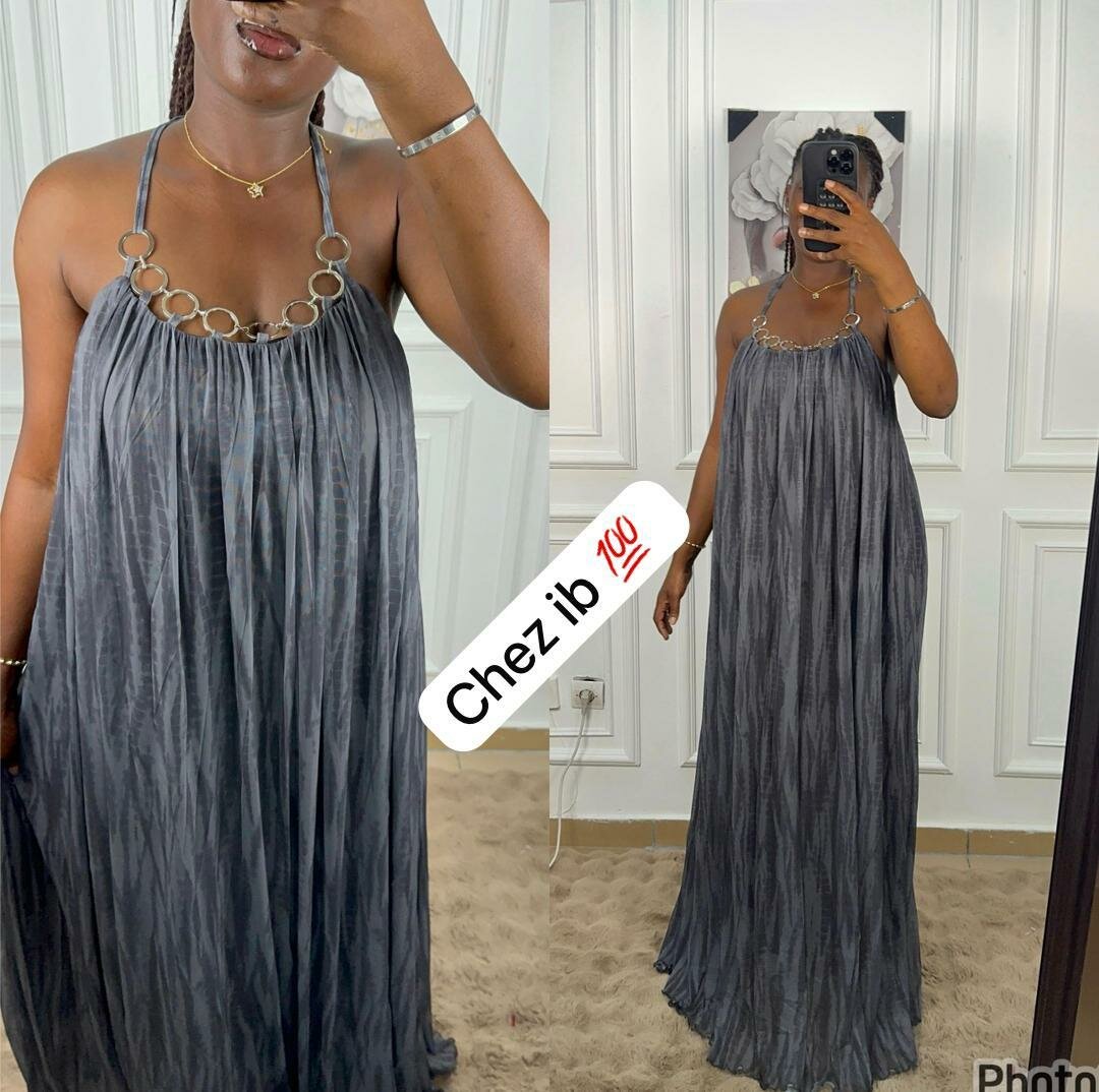 Découvrez cette robe longue élégante pour femme avec de superbes détails d'anneaux au niveau du col. Parfaite pour les soirées et les événements spéciaux, elle est confectionnée dans un tissu léger qui offre un élégant drapé. Faites tourner les têtes avec cette robe chic!