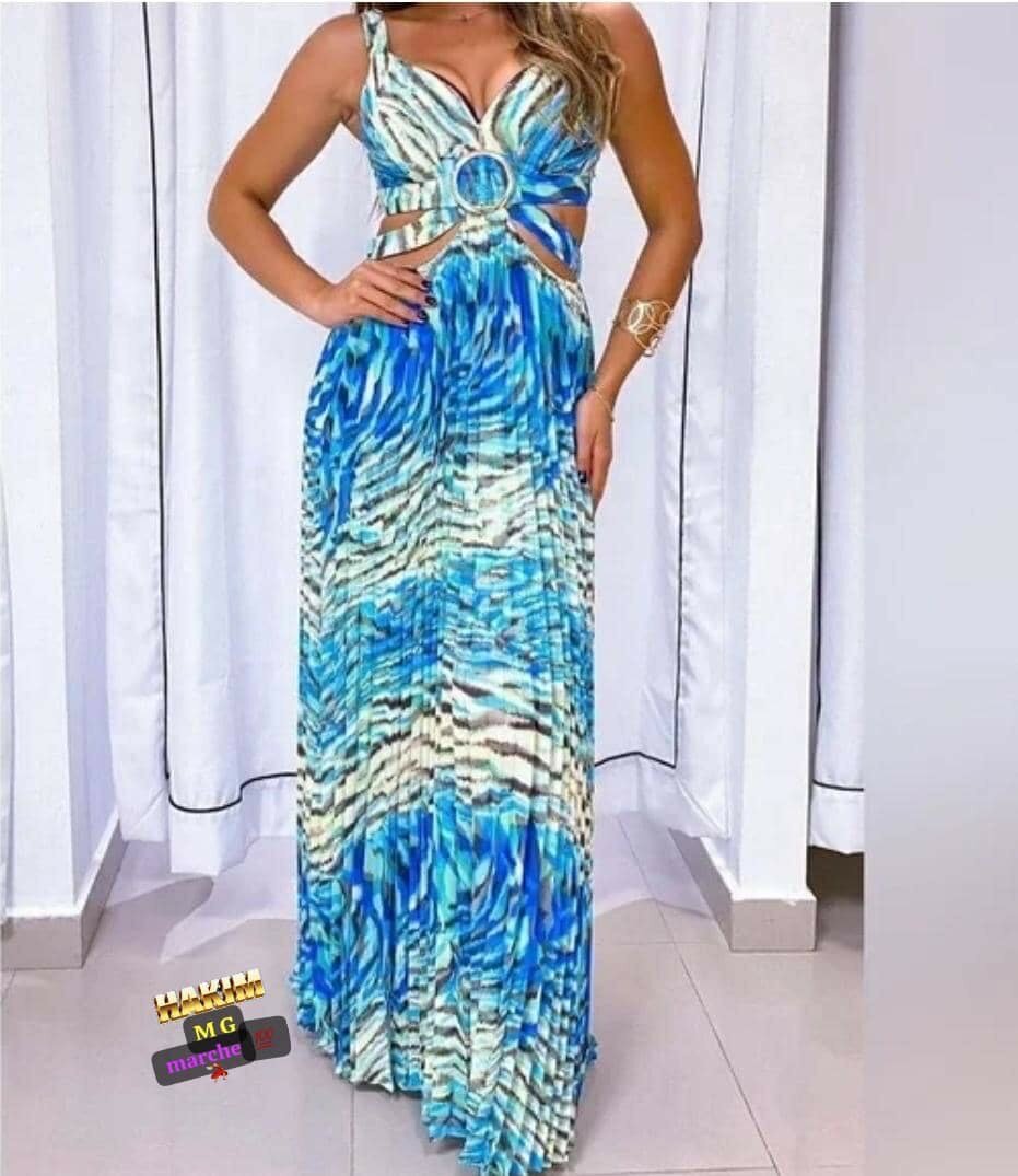 Habillez-vous avec élégance cet été avec cette robe longue à motifs bleus vibrants. Confectionnée pour les femmes modernes, elle présente des découpes audacieuses et une boucle chic à la taille, idéale pour des soirées estivales ou des événements décontractés. Sa coupe fluide assure confort et style, faisant de cette robe un choix parfait pour se démarquer.