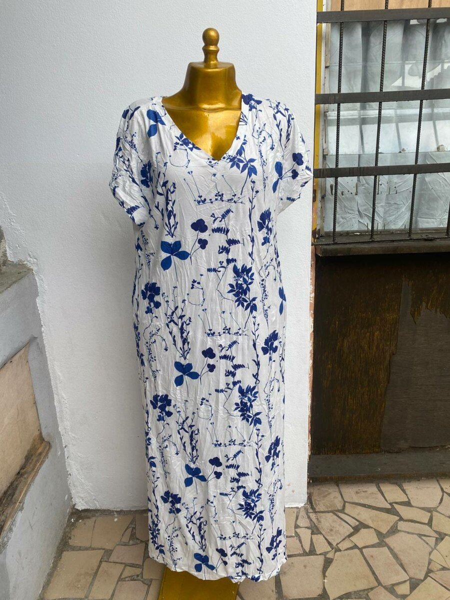 Découvrez cette robe d'été confortable et élégante, parfaite pour les journées ensoleillées. Conçue en coton léger et respirant, elle est ornée d'un motif floral bleu qui lui donne une touche de fraîcheur.