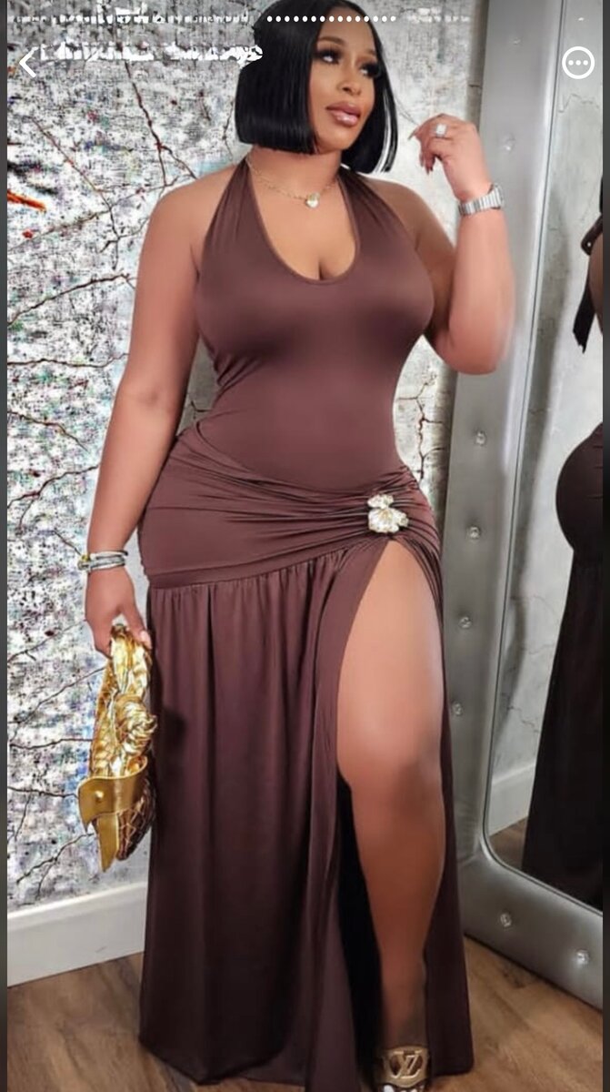 Élégante robe longue marron avec fente latérale et détails floraux. Parfaite pour des occasions spéciales, cette robe met en valeur votre silhouette avec style. Confectionnée pour un ajustement confortable et chic.