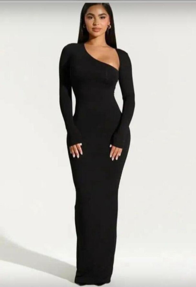 Cette élégante robe longue noire est parfaite pour toutes les occasions spéciales. Avec sa découpe asymétrique et ses manches longues, elle allie style moderne et confort. Un choix idéal pour une soirée chic ou un événement formel, cette robe mettra parfaitement en valeur votre silhouette.