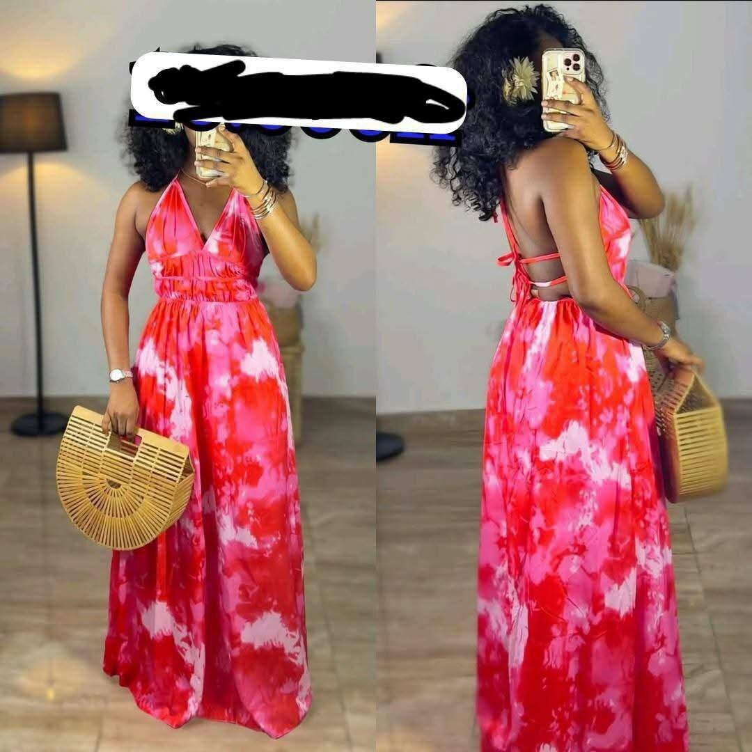 Robe longue rouge tie-dye, parfaite pour l'été. Conception élégante et confortable.