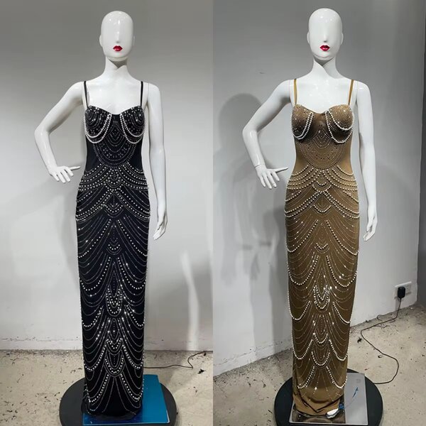 Éblouissante robe longue ajustée avec bretelles fines, parfaite pour soirées et événements spéciaux. Disponible en rouge vibrant et noir classique, cette pièce attire tous les regards avec ses détails scintillants. Matériau confortable offrant une ligne élégante et féminine. Idéale pour une allure glamour et sophistiquée.