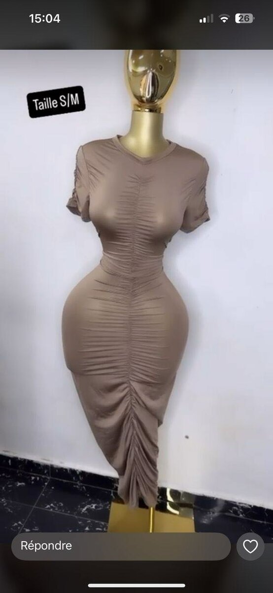 Découvrez cette robe moulante en couleur taupe, parfaite pour accentuer vos courbes avec style. Avec son design froncé central et sa coupe ajustée, elle est idéale pour des soirées ou des événements spéciaux. Fabriquée pour offrir à la fois confort et élégance.