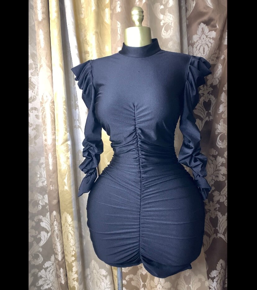 Découvrez cette robe noire ultra-moulante avec manches longues et fronces flatteuses. Idéale pour une soirée chic, elle mettra en valeur votre silhouette. Confectionnée avec des matériaux de qualité, c'est le choix parfait pour allier confort et style.