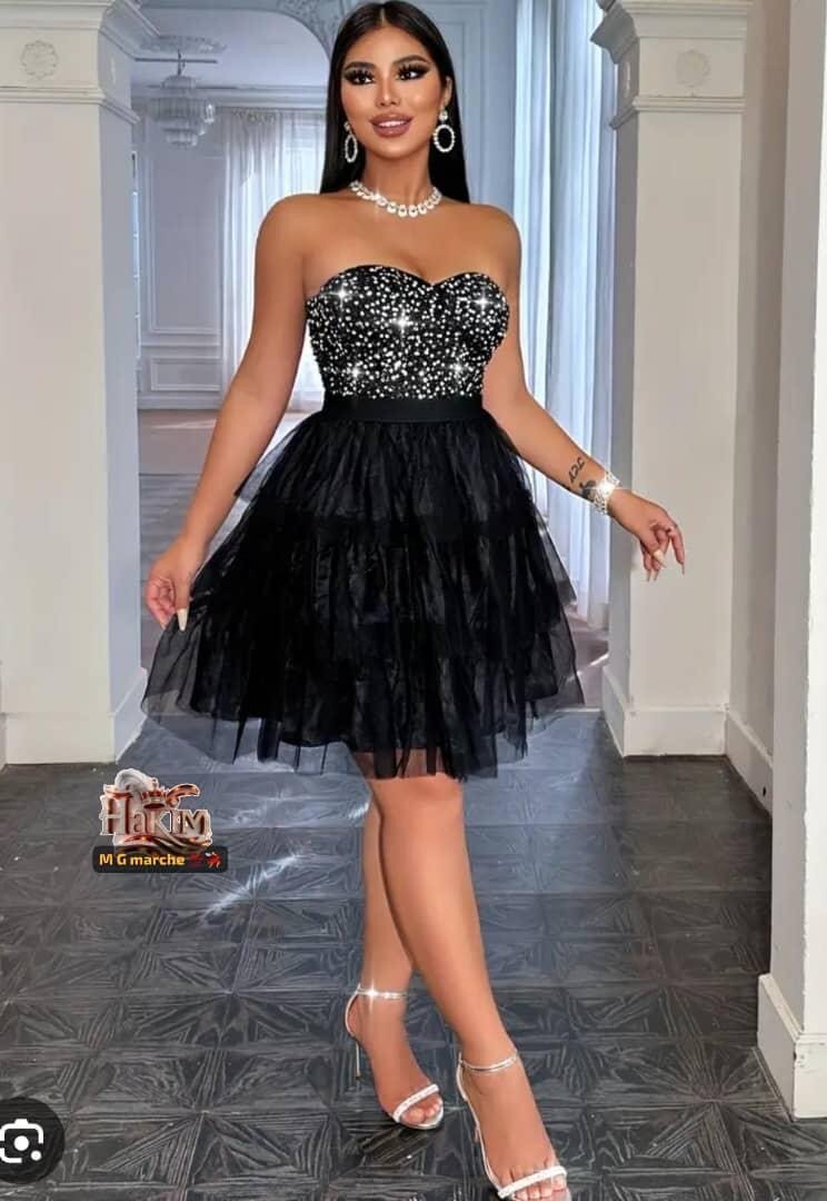 Découvrez cette robe noire élégante et moderne, idéale pour les soirées. Conçue avec des paillettes scintillantes et une jupe courte en tulle, elle offre un look glamour et féminin. Parfaite pour les jeunes femmes qui aiment se démarquer lors des occasions spéciales.