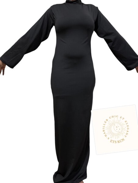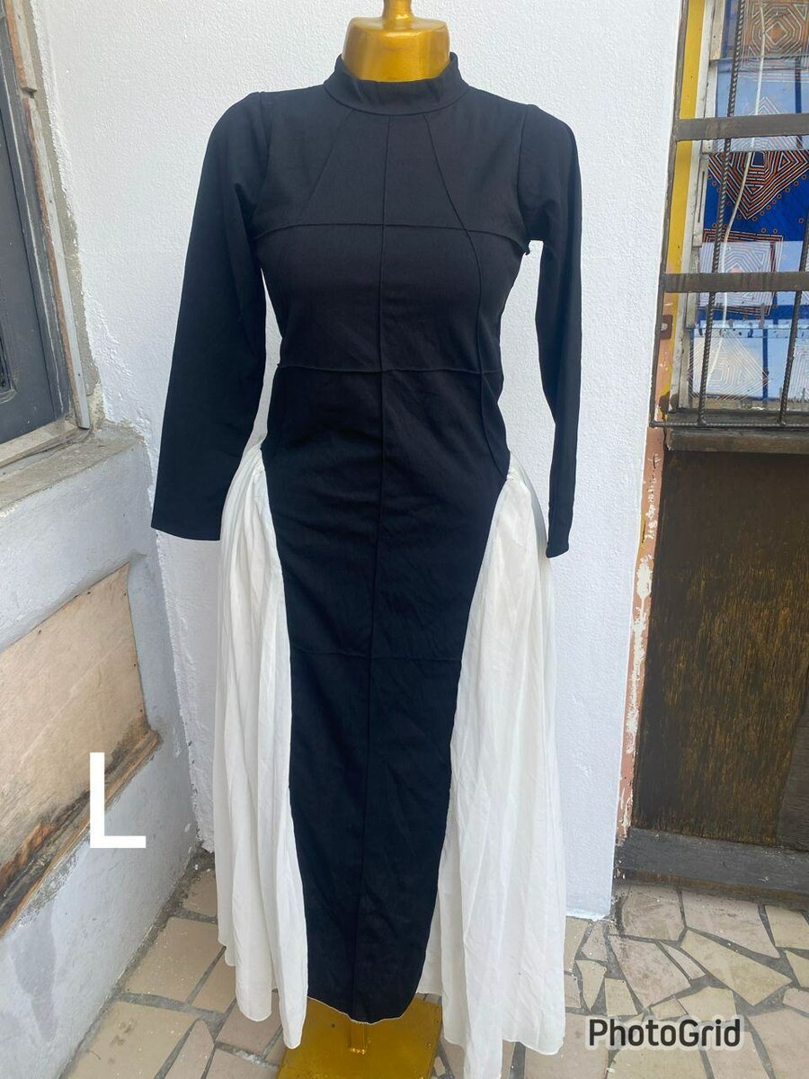 Découvrez cette robe noire ajustée avec des manches longues et une jupe à détails blancs sur les côtés. Conçue pour les femmes élégantes, cette robe est parfaite pour des occasions spéciales ou des soirées chic.