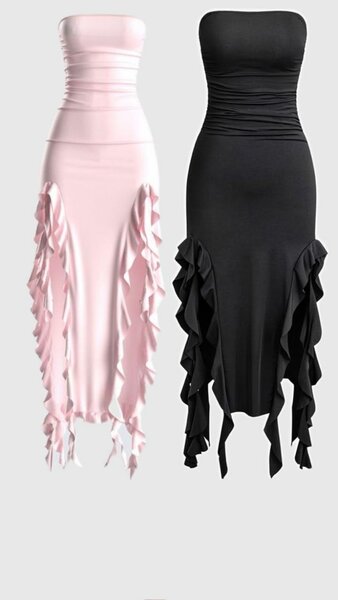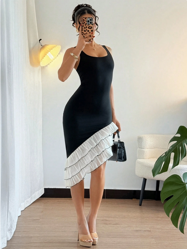 Découvrez cette robe noire élégante et moderne avec un détail asymétrique de volants blancs. Parfaite pour des événements spéciaux ou des soirées, sa coupe ajustée flatte votre silhouette. Conçue pour offrir confort et style, elle est l'ajout idéal à votre garde-robe. Associez-la avec des talons pour un look chic et sophistiqué.