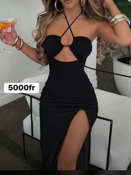 Robe noire longue, fendue, décolleté et dos croisé, style soirée, élégante et féminine.