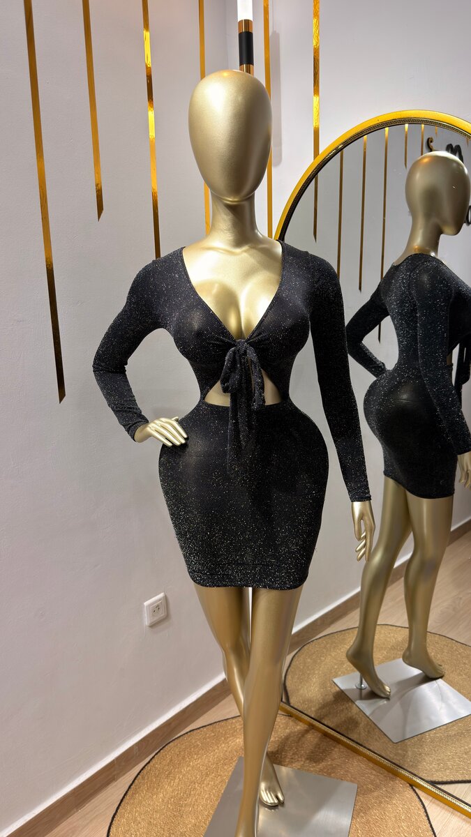 Découvrez cette robe noire scintillante, parfaite pour des soirées élégantes. Sa coupe moulante met en valeur vos courbes, tandis que le décolleté et le nœud audacieux ajoutent une touche de séduction. Fabriquée avec des matériaux de haute qualité, elle garantit un confort exceptionnel pour toute la nuit. Idéale pour les fêtes, les dîners ou les sorties en club. Faites tourner les têtes avec ce choix incontournable pour une apparence inoubliable.