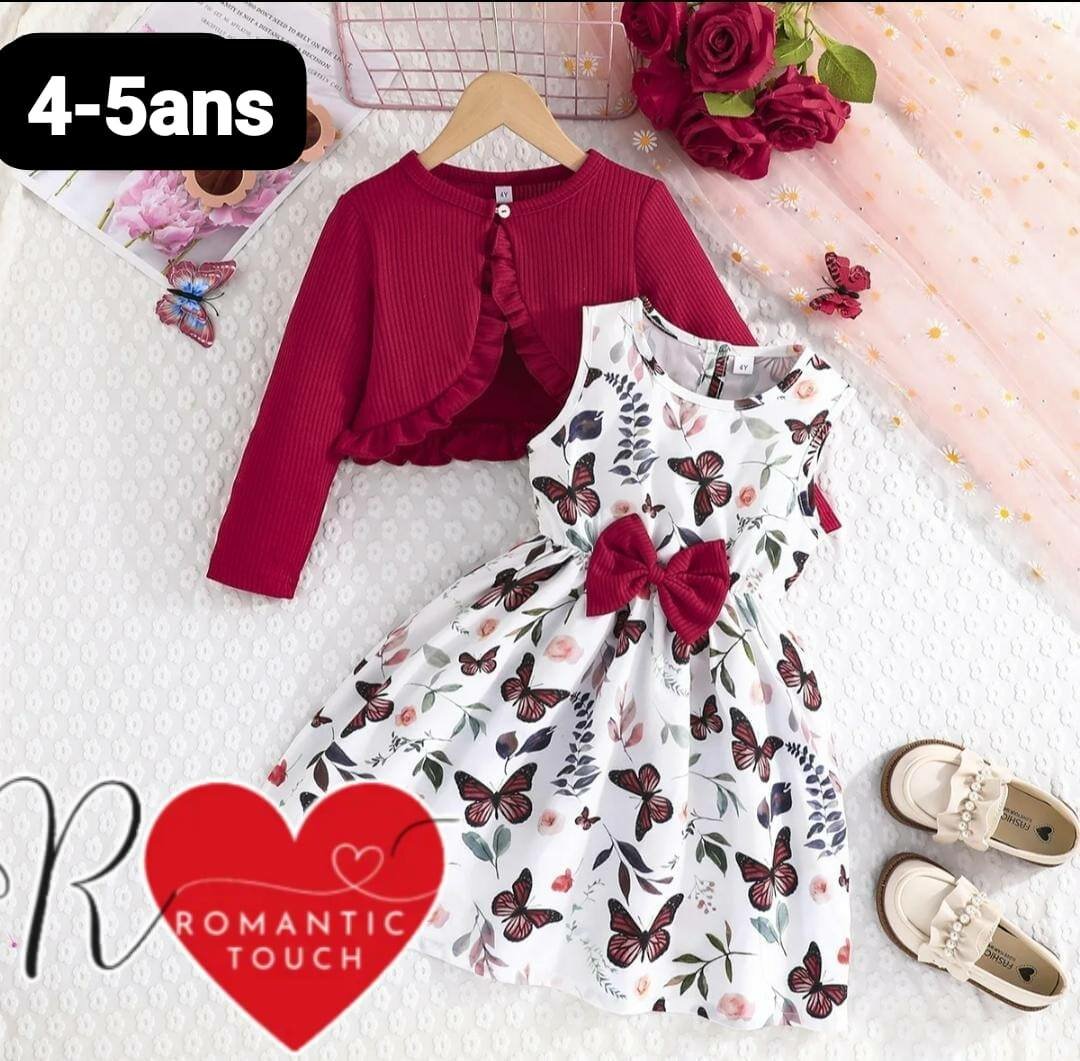 Ravissante robe avec motif papillons et élégante veste rouge pour filles 4-5 ans. Confection de qualité idéale pour occasions spéciales ou sorties printanières. Offrez style et confort à votre enfant avec Romantic Touch!