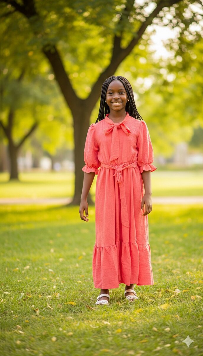 Adorable robe longue rose avec nœud et manches bouffantes pour fille. Parfaite pour des occasions spéciales ou des sorties décontractées. Confort et style garantis.