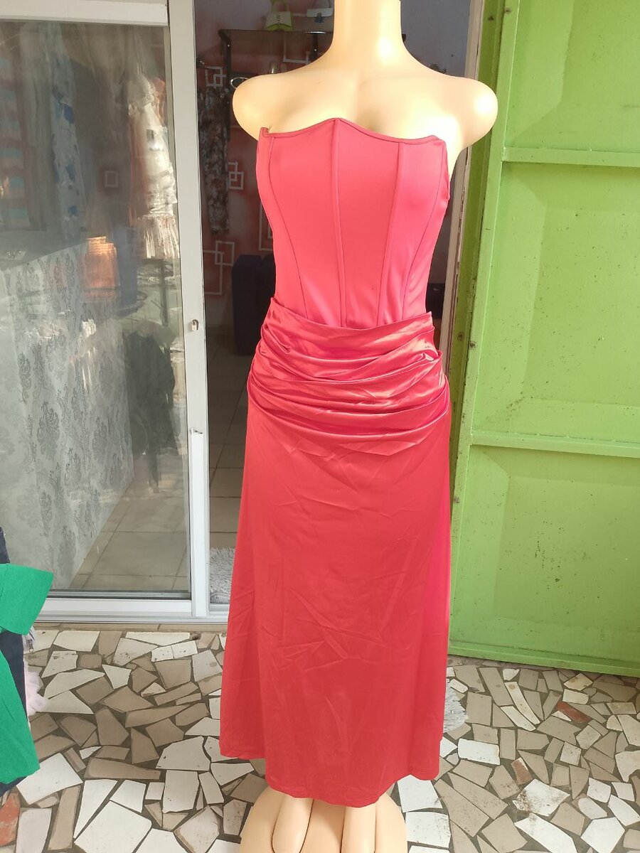 Robe rouge en satin, parfaite pour les occasions spéciales. Design ajusté avec drapé à la taille, matière lisse et confortable.