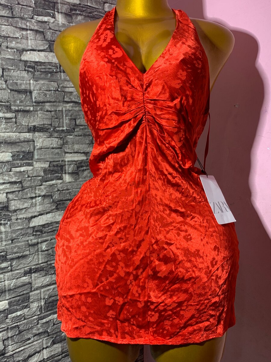 Robe rouge élégante avec dos nu, parfaite pour des soirées spéciales. Tissu brillant et design ajusté qui souligne la silhouette. Idéale pour se démarquer et attirer tous les regards.