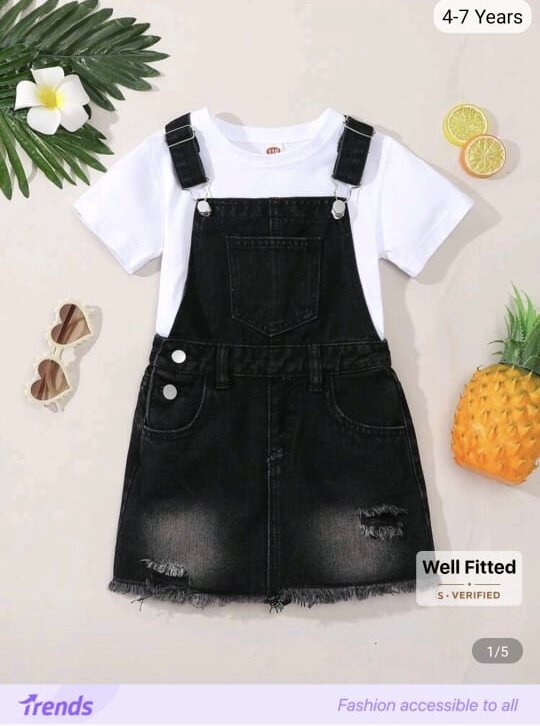 Adorable robe salopette rouge blanc pour enfant de 4 à 7 ans en denim noir avec t-shirt blanc. Parfaite pour un look décontracté et stylé. Convient pour les sorties et les occasions spéciales.