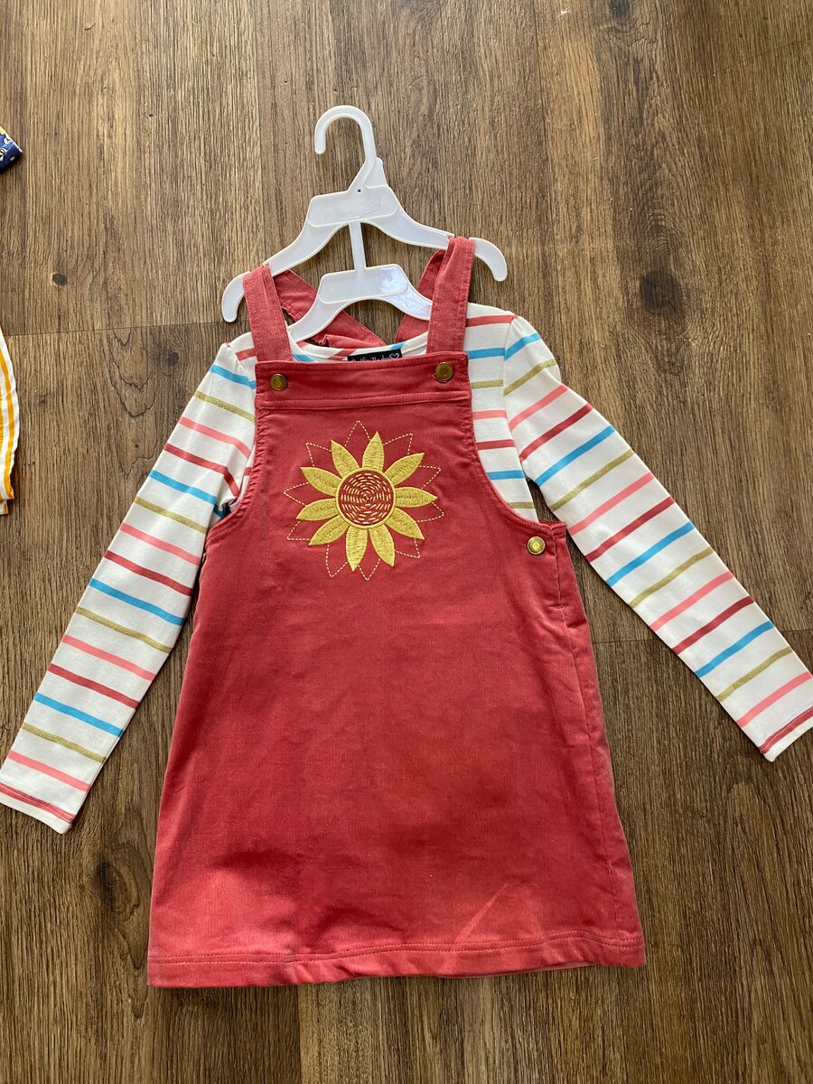 Robe salopette rouge avec motif tournesol pour fille. Conçue avec un tissu doux, elle est idéale pour un look décontracté et coloré. Convient pour toutes les saisons avec un haut à rayures. Pour occasions spéciales ou usage quotidien.