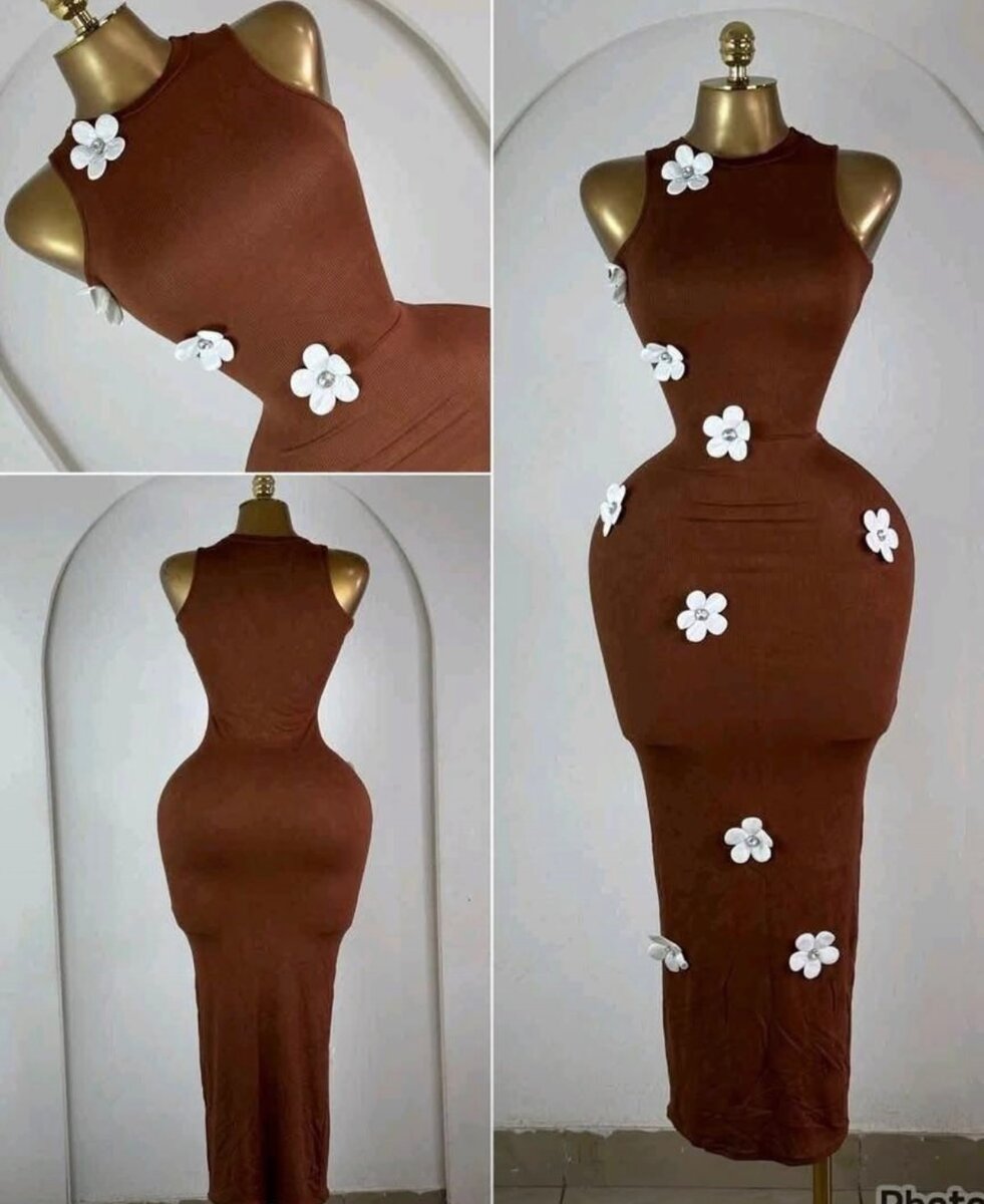 Éblouissante robe sirène avec fleurs appliquées. Conçue pour sublimer la silhouette, idéale pour soirées ou occasions spéciales. Disponible en noir et marron. Un choix parfait pour être au cœur de l'attention.