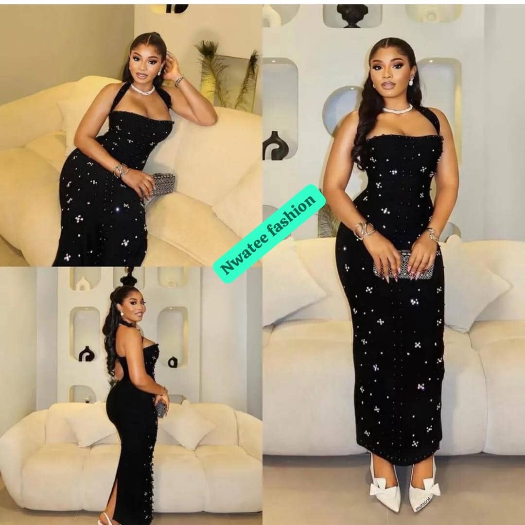 Découvrez cette robe de soirée noire élégante, ornée de détails scintillants. Parfaite pour des occasions spéciales, elle épouse vos courbes avec grâce et sophistication. Un choix idéal pour captiver tous les regards lors de vos événements.