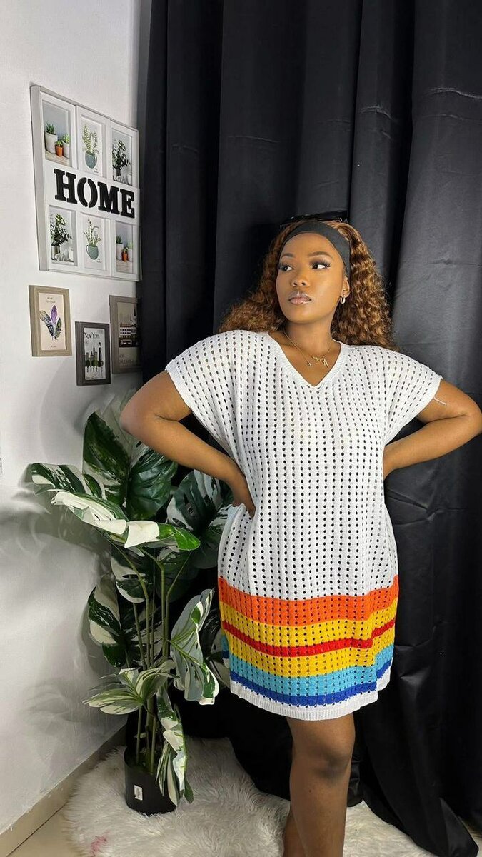 Cette robe en tricot, ornée de rayures arc-en-ciel vibrantes, est parfaite pour les journées ensoleillées. Confortable et stylée, elle convient parfaitement pour un look décontracté et original. Fabriquée à partir de matériaux doux, elle est idéale pour des sorties estivales ou des moments de détente à la maison. Son design unique attirera tous les regards, faisant d'elle un indispensable de votre garde-robe.