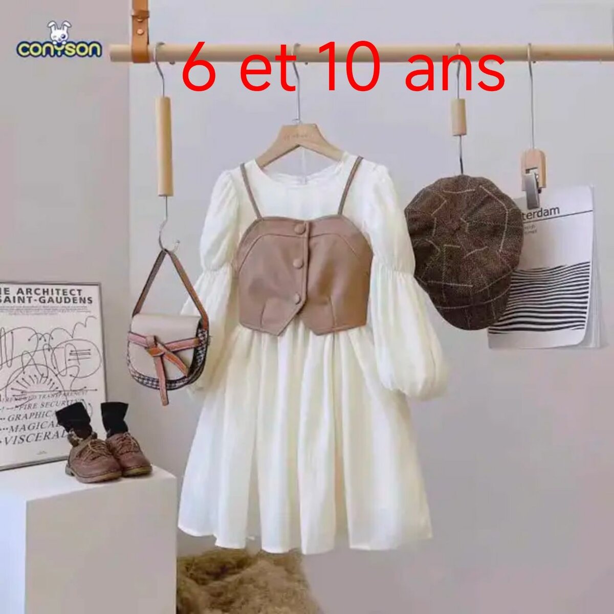 Charmante robe vintage en blanc et marron pour fille, parfaite pour des occasions spéciales. Robe en tissu léger avec corsage ajusté, adaptée pour les filles de 6 à 10 ans. Idéale pour un look chic et élégant.