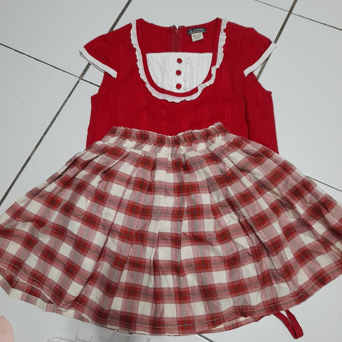 Ravissante robe vintage rouge avec jupe à carreaux et détails en dentelle. Parfait pour un look rétro et charmant. Idéale pour les femmes aimant un style unique et nostalgique.