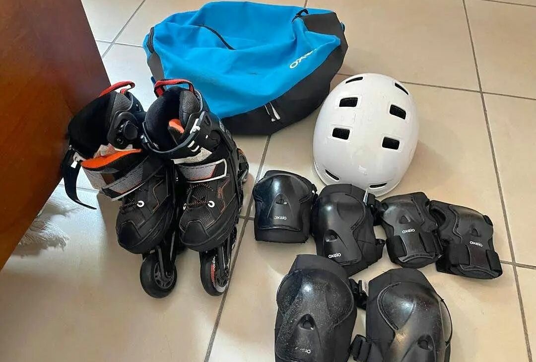 Roller en ligne avec casque et protections pour genoux et coudes. Idéal pour les amateurs de sports de glisse. Conçu pour une protection maximale et un confort optimal.