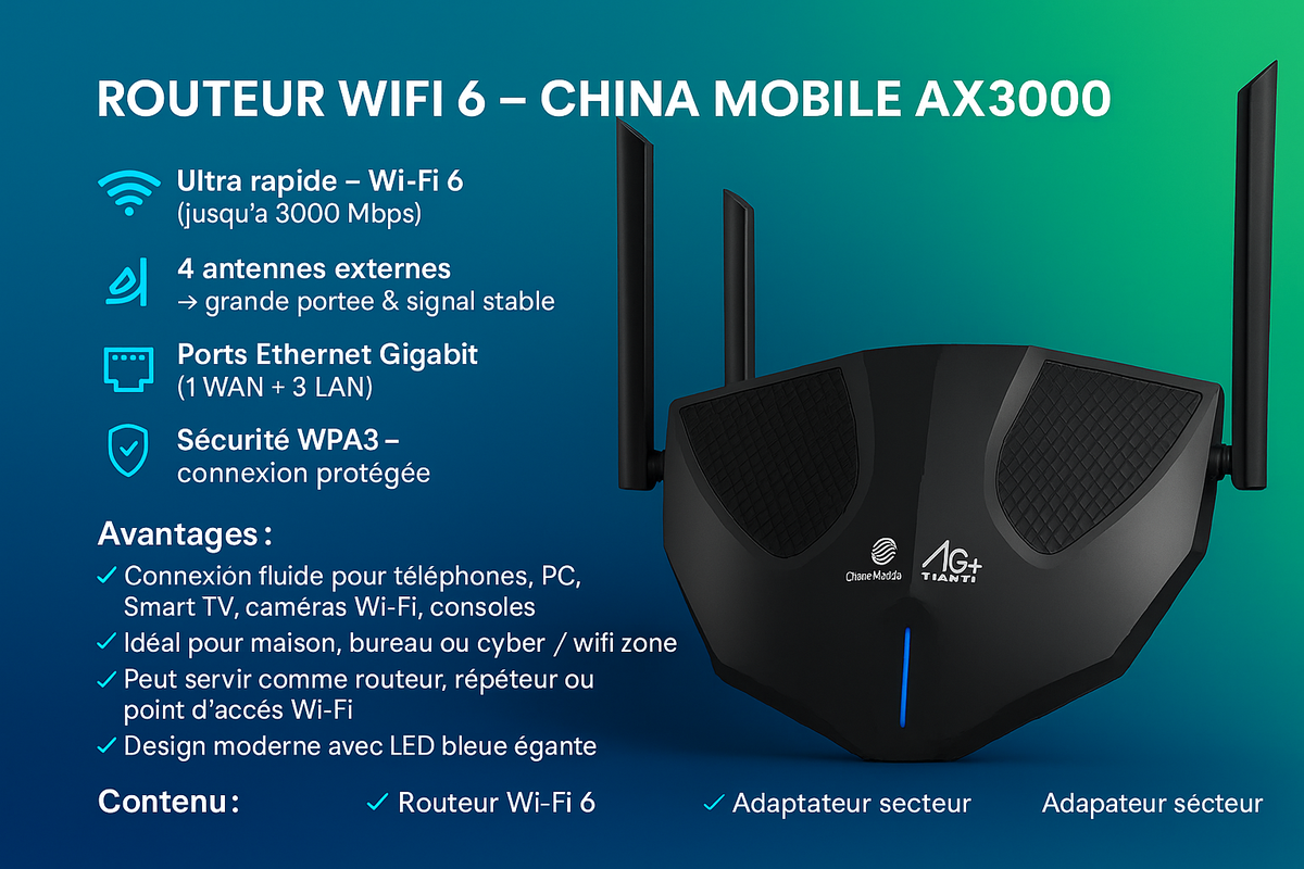 Optez pour le routeur WiFi 6 AX3000, une solution ultra rapide grâce à la technologie WiFi 6 offrant jusqu'à 3000 Mbps. Équipé de 4 antennes externes pour une couverture optimale et des ports Ethernet Gigabit, il garantit une connexion sécurisée avec la technologie WPA3. Idéal pour un usage à la maison ou au bureau, ce routeur performant peut aussi servir de point d'accès Wi-Fi. Interface china mobile