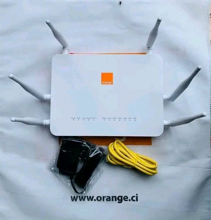 Découvrez le routeur Wi-Fi Orange, conçu pour offrir une connexion internet rapide et stable. Équipé de plusieurs antennes pour une couverture optimale, il est idéal pour une utilisation domestique ou professionnelle. Livré avec un adaptateur secteur et un câble Ethernet jaune.