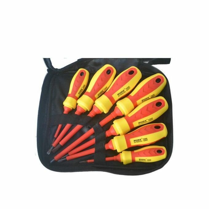 Set Kit 7 pièces professionnel pour tournevis électricien dans un sac testeur de phase en acier au chrome vanadium étoile et pointe plate, poignée ergonomique Tournevis isolés Ruike japonais d'origine Jeu de tournevis plats et jeu de tournevis plats RUIKE et RUIKE 7 tiges 7690 isolés en toute sécurité avec un kit de réparation synthétique RUIKE 7690 série 1000V avec divers outils et crics Différentes tailles permettront de réparer plus facilement et plus facilement les articles ménagers, l'électronique, les machines, y compris: -3x75mm -5x100mm -6x100mm -6x150mm 6x100mm -5x100mm -3x37mm Bols vis avec une capacité d'isolation jusqu'à 1000 V. Le produit a des couleurs exceptionnelles, la poignée est recouverte d'un matériau solide, créant une sensation compacte et ferme lors de la manipulation. Le matériau en alliage est dur, de haute résistance et stable. L'outil est isolé en toute sécurité avec un courant de 1000 V, adapté à la réparation électrique civile.