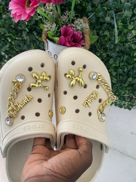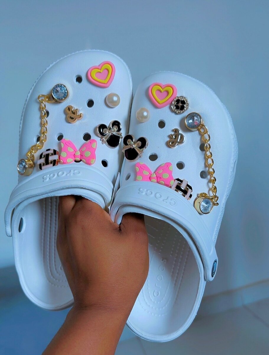 Découvrez ces sabots blancs uniques, ornés de charms colorés et de chaînes dorées. Parfaits pour un look amusant et personnalisé, ils assurent confort et style. Idéal pour un usage quotidien ou une touche spéciale à votre tenue décontractée.