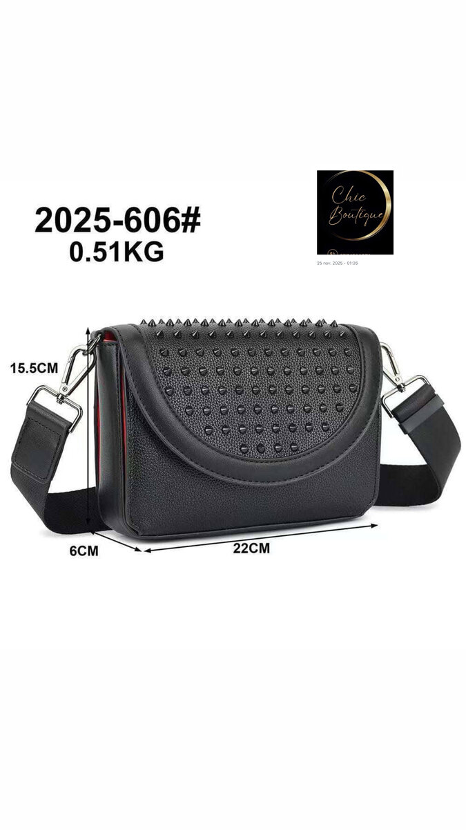 Découvrez le sac à bandoulière clouté, parfait pour ajouter une touche rock à votre style. Fabriqué avec des matériaux durables, il offre assez d'espace pour vos essentiels tout en restant léger et confortable. Idéal pour une tenue décontractée ou une sortie nocturne. Dimensions : 22x15.5x6 cm.
