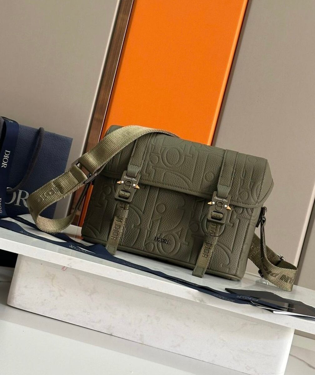 Sac Dior en cuir vert avec motif embossé, idéal pour les hommes modernes. Design élégant et durable, parfait pour le quotidien ou les voyages.