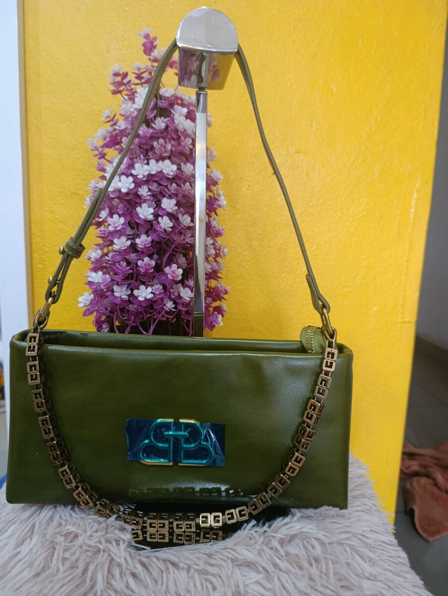 Ajoutez une touche d'élégance à votre tenue avec ce sac à bandoulière en cuir vert. Doté d'une chaîne dorée détaillée et d'une fermeture moderne, ce sac est parfait pour les sorties en ville ou les soirées. Compact mais spacieux, il accueille aisément vos essentiels. Idéal pour les occasions spéciales ou un usage quotidien raffiné.