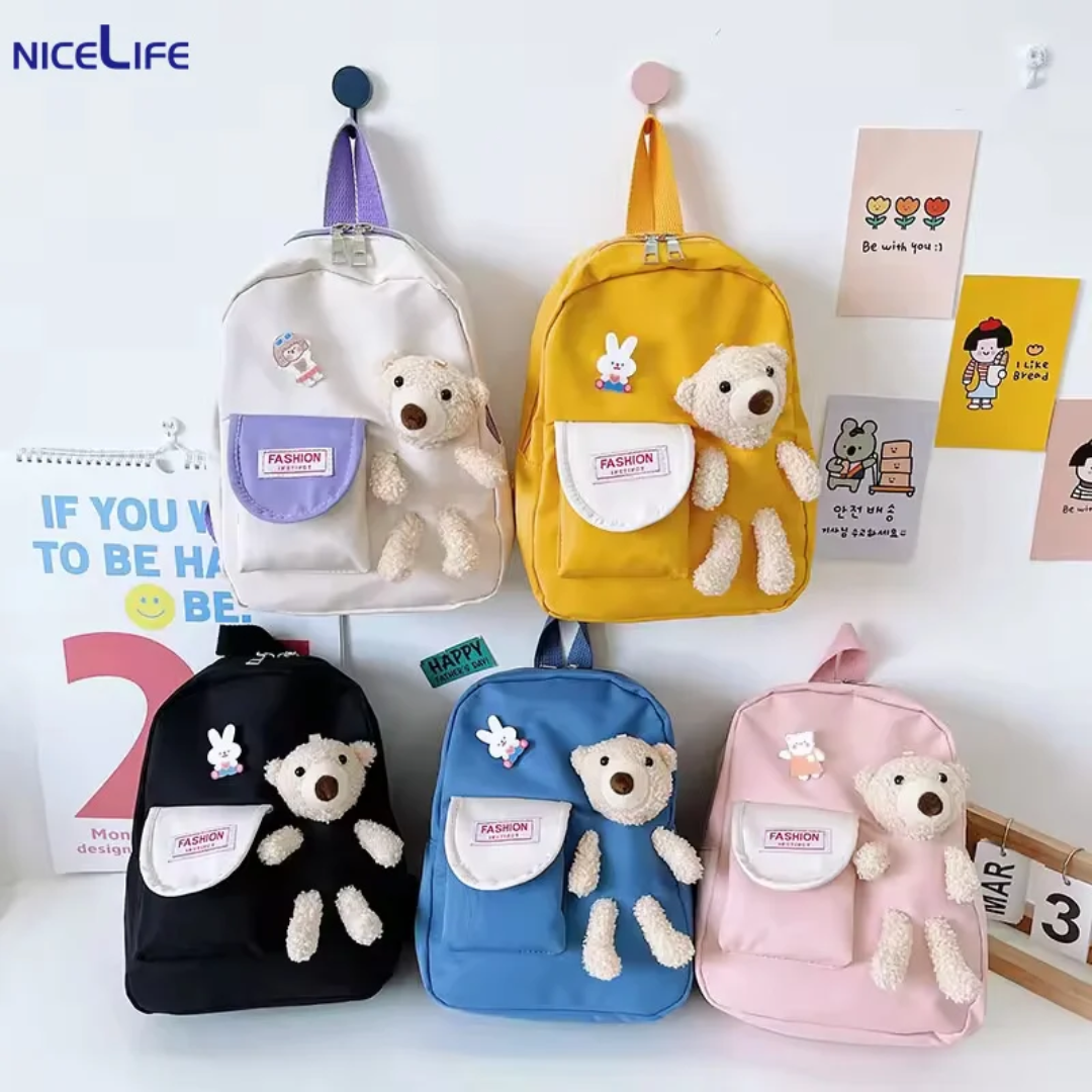 Adorable sac à dos pour enfants, avec une peluche attachée. Parfait pour l'école ou les sorties. Disponible en plusieurs couleurs .