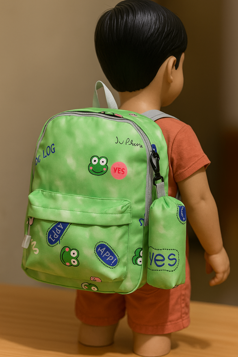 Charmant sac à dos vert avec motif grenouille, idéal pour les petits. Pratique et amusant pour l'école ou les sorties.