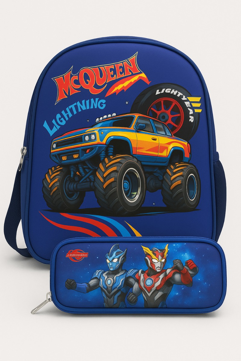 Sac à dos pour enfant avec trousse assortie, parfait pour l'école. Design vibrant avec voitures colorées et super-héros. Léger et confortable, idéal pour une utilisation quotidienne.