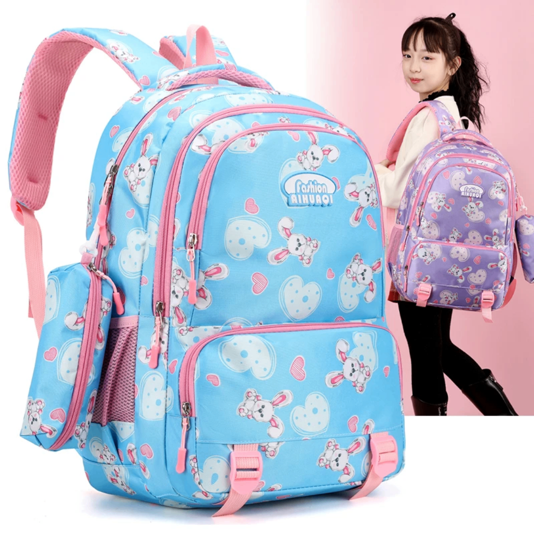Ce sac à dos enfant en bleu clair avec motifs de lapins est parfait pour l'école et le quotidien. Doté de plusieurs poches pratiques, il offre un rangement optimal pour les affaires scolaires. Confortable et durable, il est idéal pour accompagner les aventures de votre enfant.