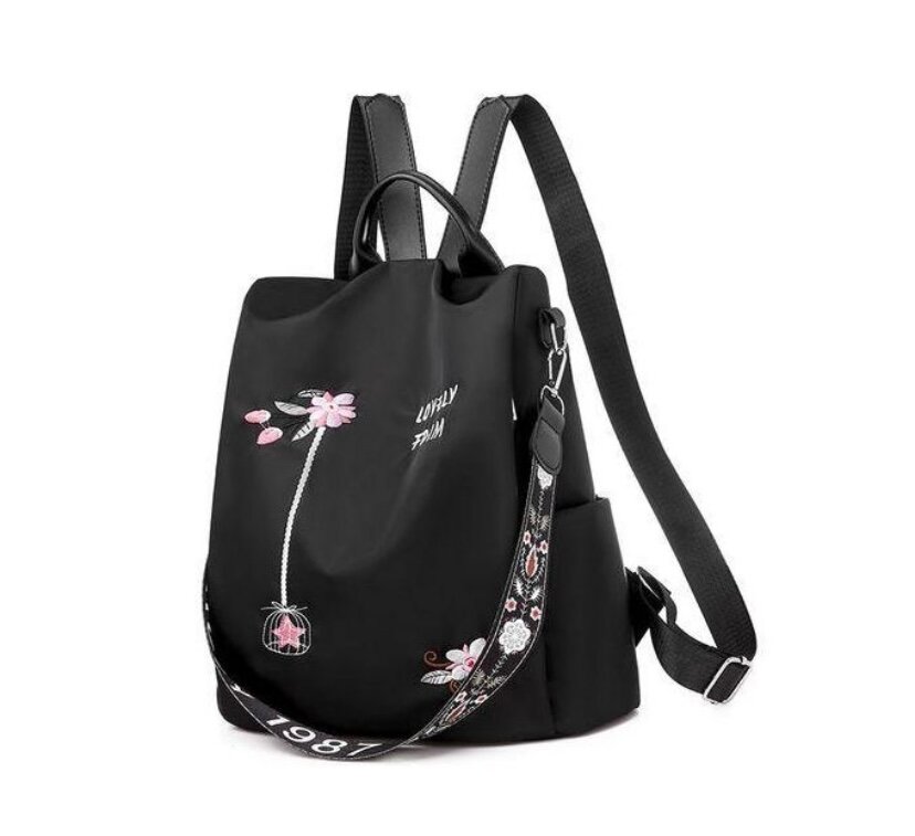 Sac à dos noir avec motifs floraux roses. Convient pour un usage quotidien. Dispose dun grand compartiment et de bretelles réglables. Léger et pratique pour les déplacements.