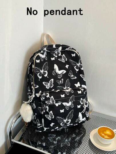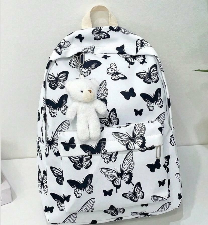 Découvrez ce sac à dos tendance orné de motifs papillon et accompagné d'une adorable peluche. Idéal pour l'école ou les sorties, il combine style et praticité. Spacieux et léger, il offre un grand compartiment principal et une poche avant pour un rangement optimisé. Fabriqué avec des matériaux durables, c'est le compagnon parfait pour les enfants.