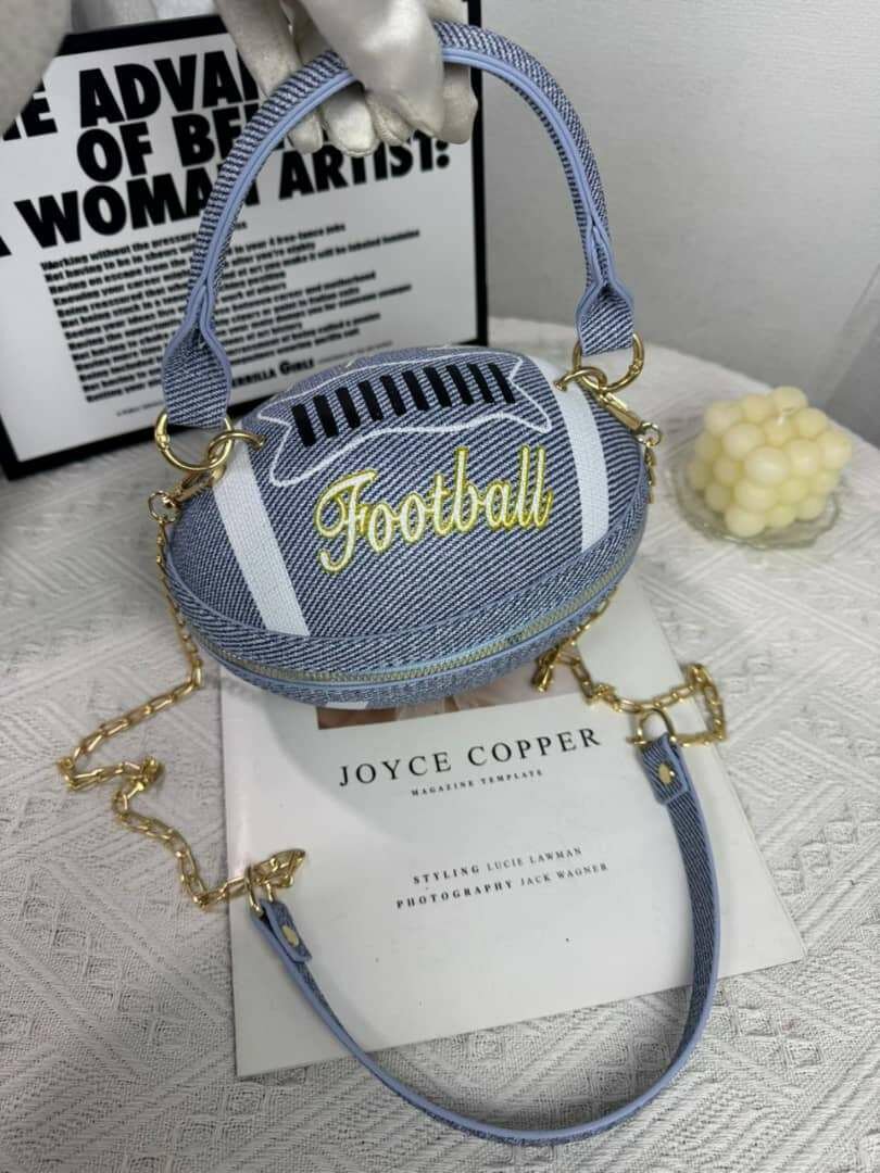 Ce sac à main unique en forme de ballon de football est idéal pour les amateurs de style original. Avec son design en denim, il ajoute une touche sportive et chic à votre tenue. Parfait pour les sorties décontractées ou pour faire une déclaration de mode. Comprend une sangle dorée et un fermoir sécurisé.