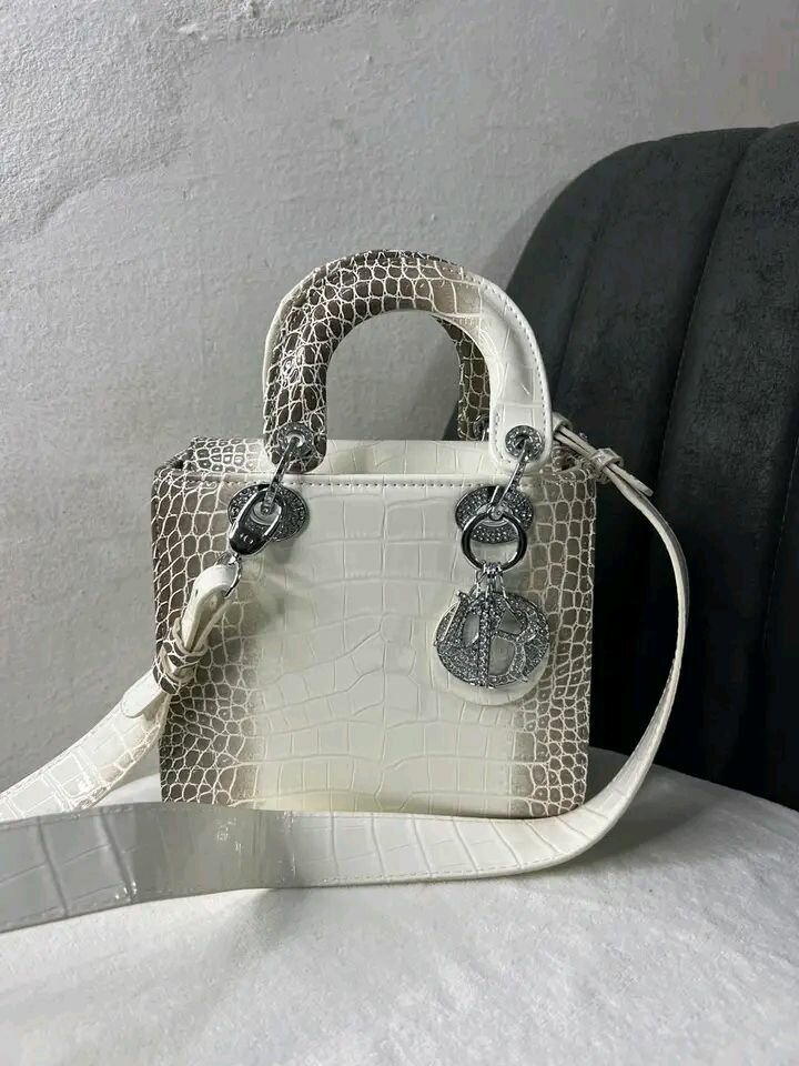 Élégant sac à main blanc en cuir crocodile avec poignée et bandoulière. Fermeture éclair et détails métalliques. Parfait pour les occasions spéciales ou le quotidien.