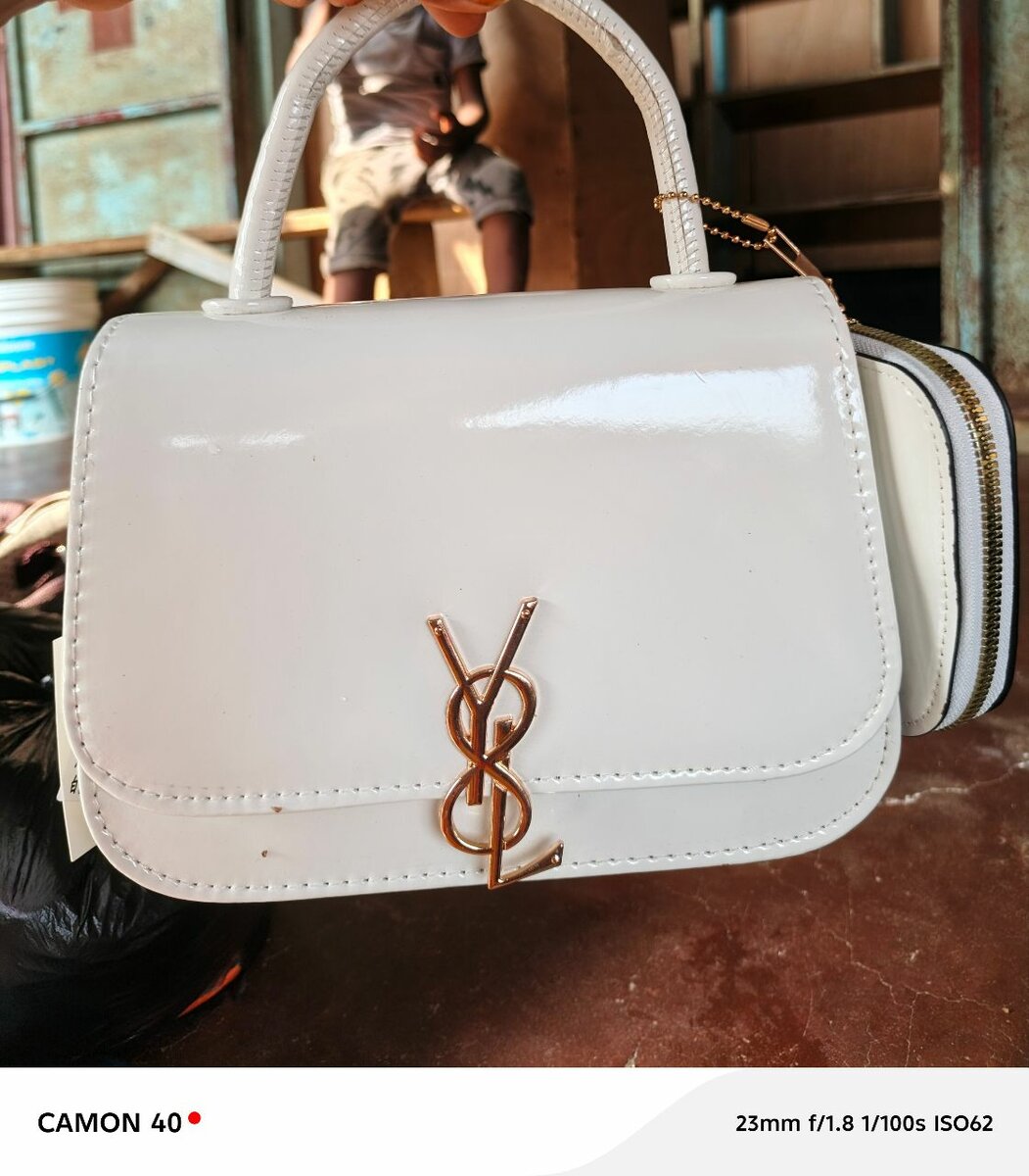 Élégant sac à main en cuir blanc avec logo YSL doré. Design moderne et chic, idéal pour les femmes qui aiment les accessoires de luxe. Parfait pour une soirée ou une occasion spéciale.