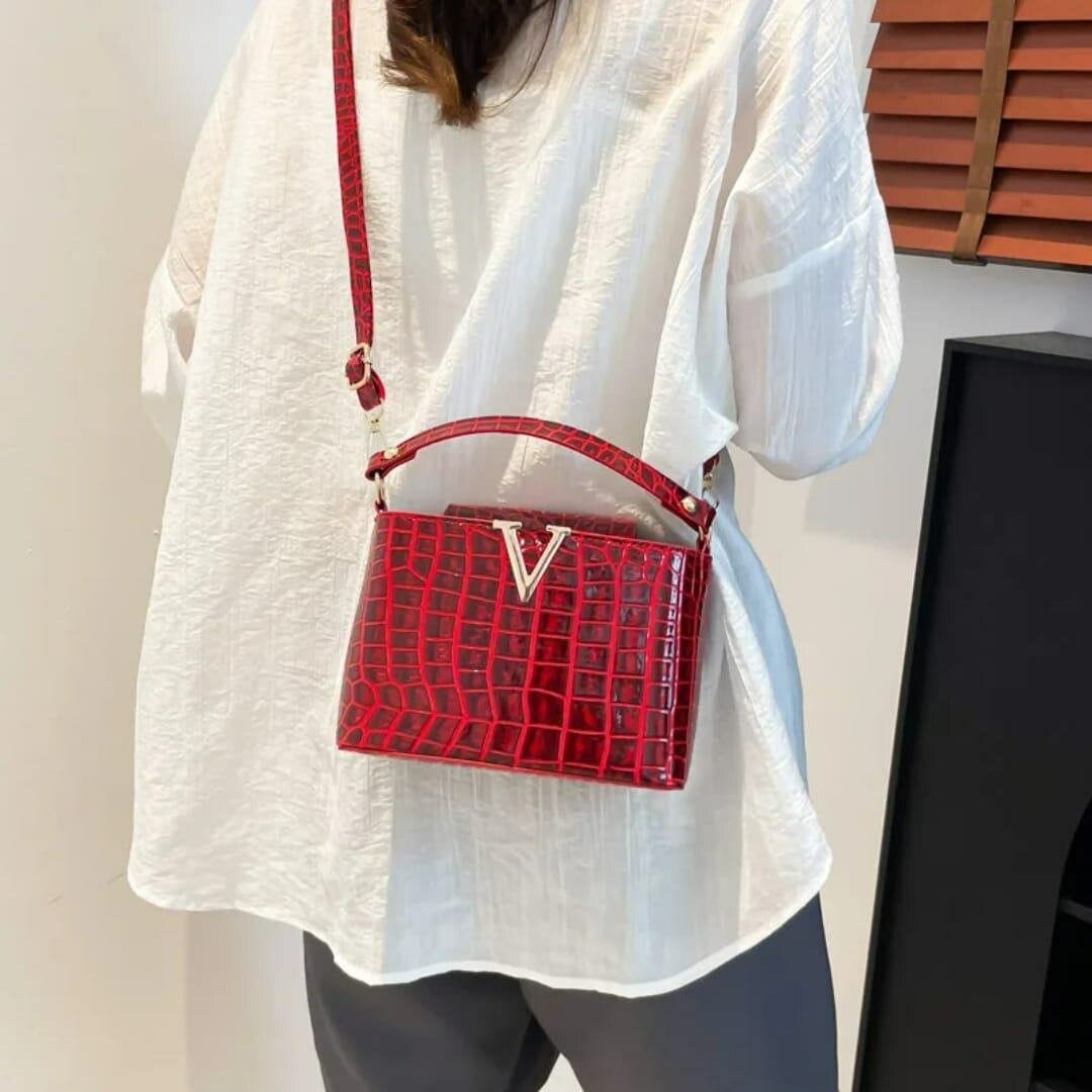 Optez pour ce sac à main rouge en cuir crocodile, parfait pour ajouter une touche d'élégance à vos tenues. Compact et stylé, il est idéal pour les sorties en ville ou les évènements spéciaux. Sa bandoulière ajustable et sa taille pratique le rendent incontournable pour toute occasion. Complétez votre look avec ce sac unique!