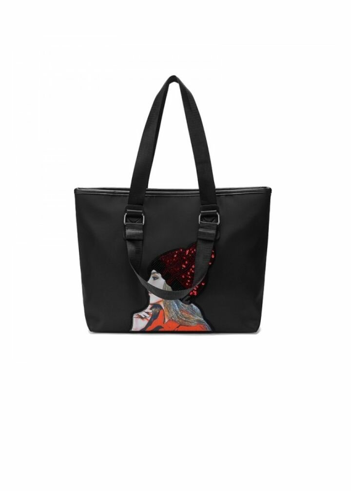 Ajoutez une touche d'élégance à votre tenue avec ce sac à main noir orné d'un motif artistique captivant. Parfait pour les sorties quotidiennes ou les occasions spéciales, il combine style et fonctionnalité avec ses larges anses et son espace généreux.