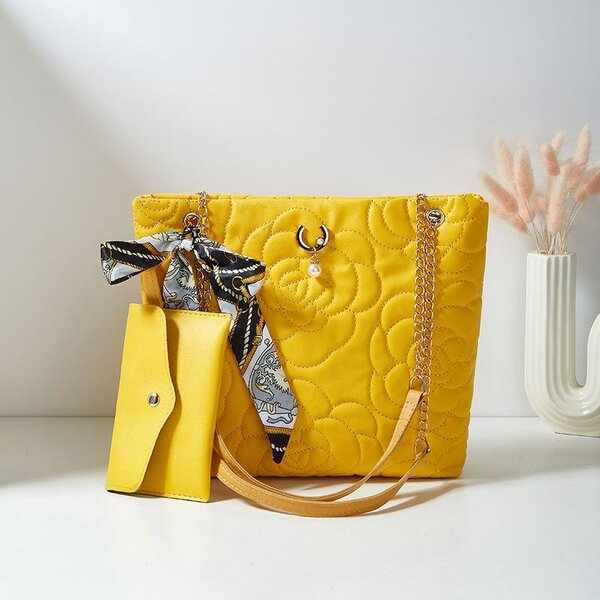 Ce sac à main matelassé offre une touche de sophistication avec son design élégant et ses détails en métal doré. Agrémenté d'un foulard chic et d'une chaîne décorative, il est idéal pour les occasions formelles ou les sorties quotidiennes. Disponible en plusieurs couleurs vibrantes, il complétera parfaitement votre tenue.
